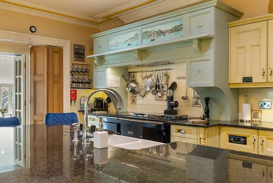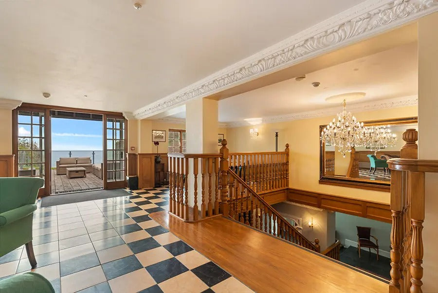 Spend the day relaxing in gardens carved by the sea, strolling through the bluebell woods or clambering over rocks. When evening rolls around, retreat inside the grand, double-height entrance to find cool and contemporary interiors with a sea-inspired palette by interior designer Karine Kaelin.